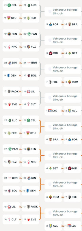 Après le tirage au sort des barrages de la Ligue des Champions, programmé à 12h, l'UEFA effectuera ce vendredi, à 13h, celui de la Ligue Europa. Contrairement à la C1, il n'y aura pas de choc 100% français possible - pour l'instant - puisque Lyon a obtenu son billet direct pour les 8es de finale avec sa première place. Lille (18e), en revanche, devra passer ce tour supplémentaire avec un match contre l'Etoile Rouge de Belgrade (15e) ou le Celta Vigo (16e).