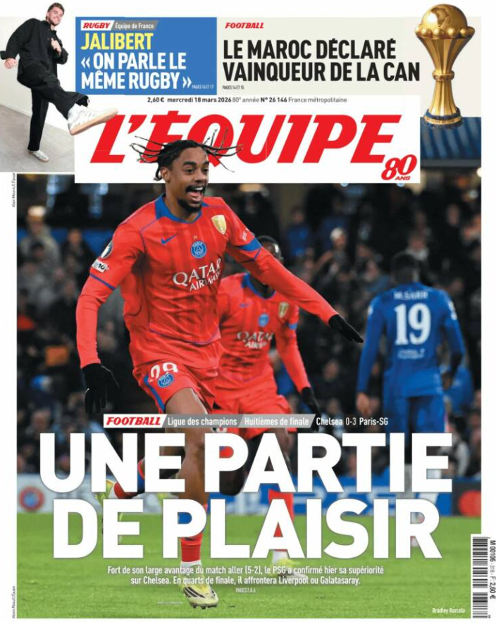 Même le Guardian, souvent plus mesuré, a eu des mots forts pour la prestation parisienne, dont la qualification est évidemment amplement méritée. «Le PSG, impitoyable, condamne Chelsea à une élimination humiliante. La victoire estivale de Chelsea au Mondial des clubs n'était qu'un rêve américain estival. Ici, sur la scène qui compte vraiment, ils ont été humiliés par des adversaires qui, dès le début, évoluaient sur une autre planète», ont jugé nos confrères, décidément sous le charme.